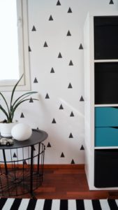 Ja koska minulla on tapana haastaa ja rohkaista asiakkaita valinnoissaan, niin aikuisten makuuhuoneeseen ehdotin värikästä, mutta erittäin tyylikästä tapettia, joka sopi lattian kanssa täydellisesti. Tapettiin ei olisi missään nimessä käynyt vaaleat seinät ympärille, joten valitsin muille seinille tummansinisen maalin. Näin makuuhuoneesta tuli pesämäinen ja viihtyisä tila, jonka täydentää ikkunasta näkyvä metsärinne.