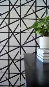 Yläkerrosten huoneisiin haluttiin myös vaaleat seinät, joten päädyin ehdottamaan graafisia tapetteja, joissa pohjavalkoisen sävy sopi lattian kanssa. Ennen ostopäätöstä testasimme tapetit myös paikan päällä asiakkaan kanssa.